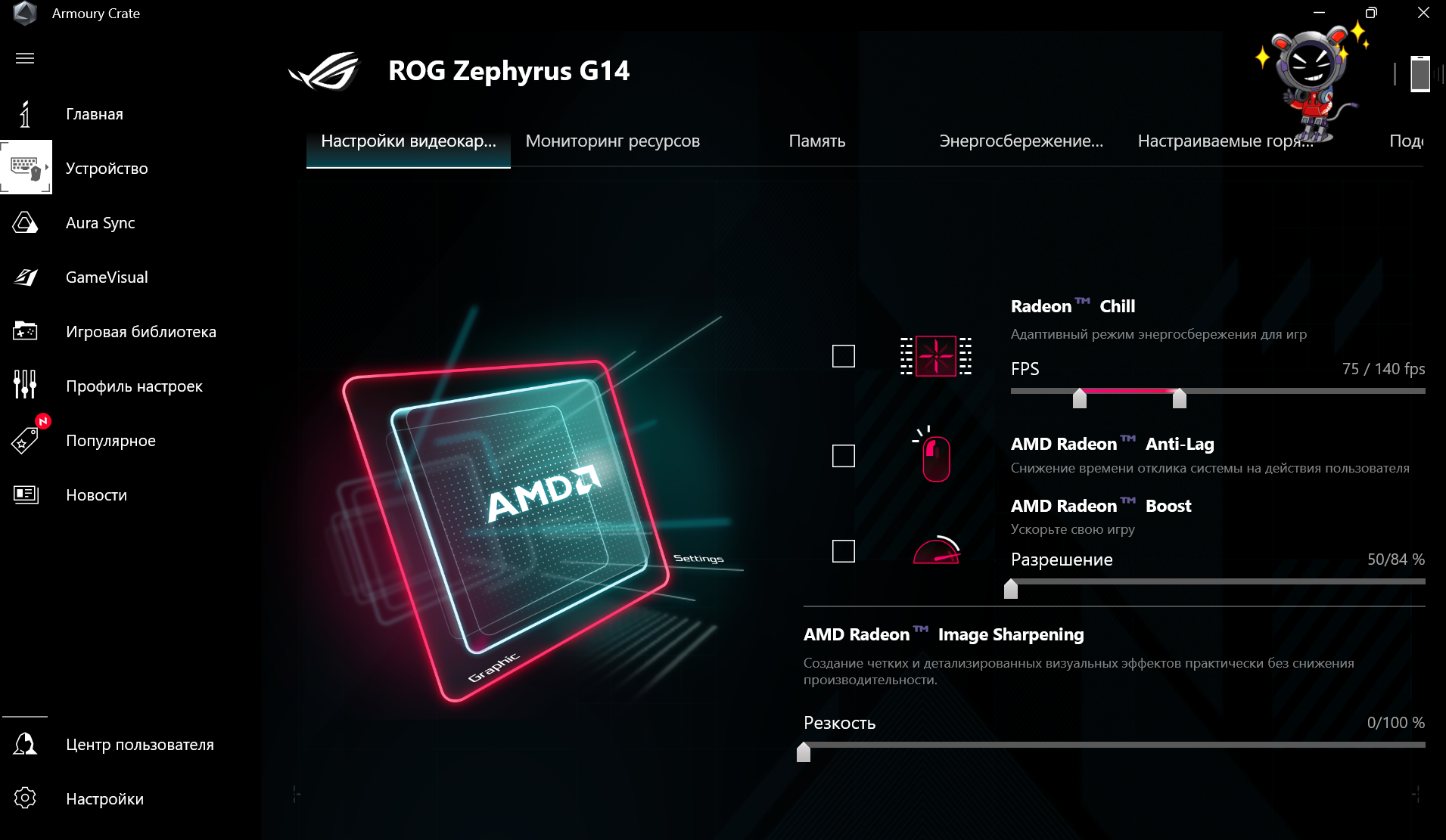 Ноутбук ASUS ROG Zephyrus G14 оснащен инновационной охлаждающей системой, которая обеспечивает эффективное управление теплом даже во время интенсивных нагрузок.